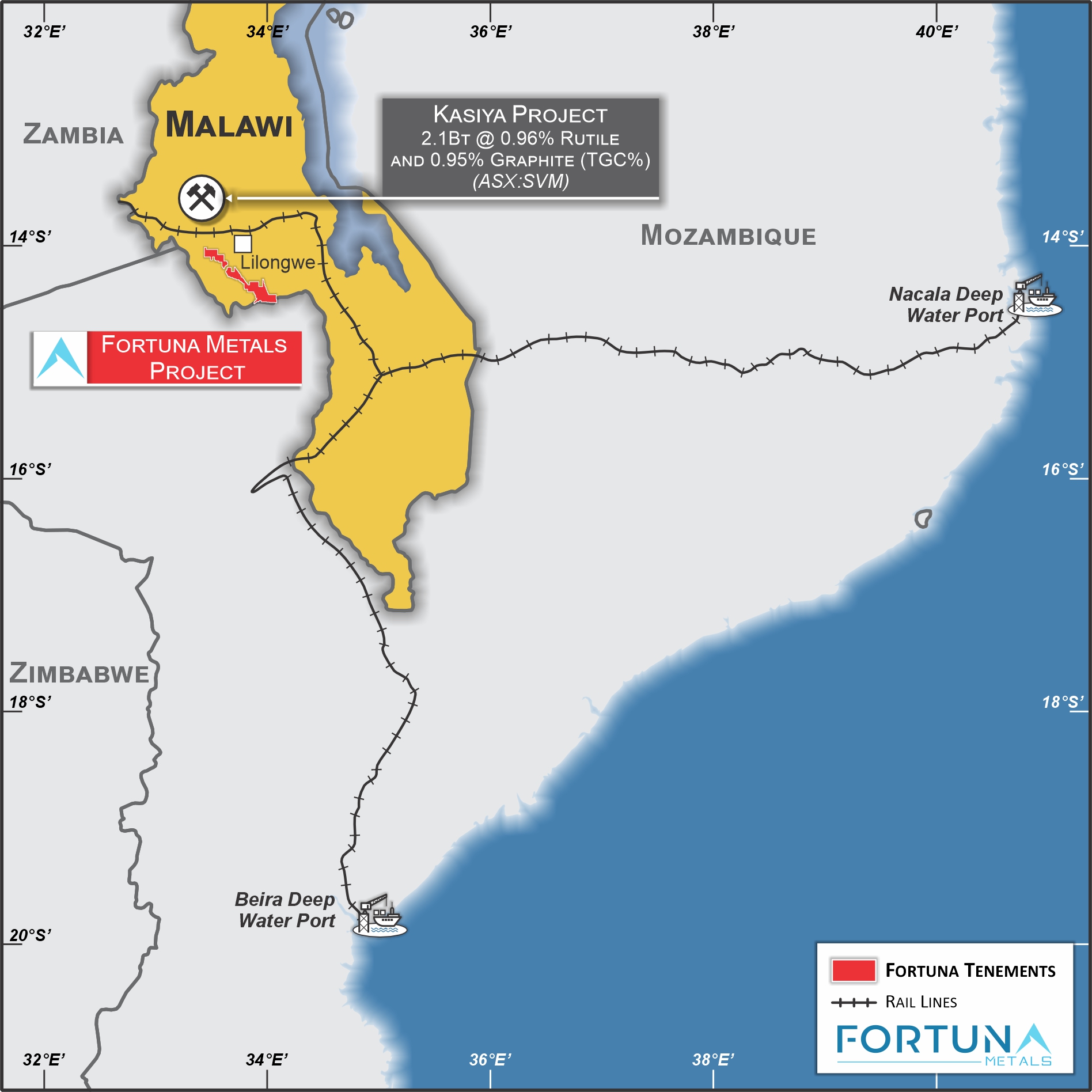 Fortuna has made a significant discovery confirmed by drill results showing multiple zones of high grade rutile from surface to 10m depth with the majority open at depth, along strike and laterally over large areas at the Mkanda project. The company believes the project area is extremely prospective to target a Tier One multi commodity Rutile-Graphite-Rare Earths deposit from surface. Malawi is an emerging major new rutile province, and a stable democratic nation referred to as the Warm Heart of Africa. The country boasts excellent surrounding infrastructure with sealed roads, hydro-sourced grid power and the Nacala rail way ~11km north of the project connecting to the deep-water port of Nacala on the Indian Ocean.